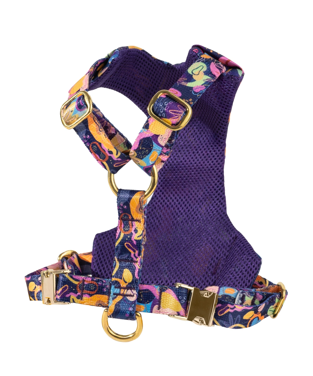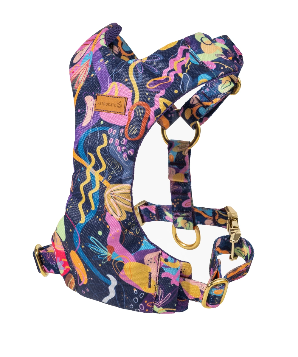 Dzięki dużemu zakresowi obwodu, rozmiar M pasuje na springer spaniela, chociaż do tej pory musiałam robić szelki na wymiar, bo pies miał szyję w rozmiarze M, a klatkę piersiową L. Wzór przyciąga spojrzenia i uśmiechy napotkanych osób, a ciemne tło w połączeniu z pstrokatymi wzorami powoduje, że nie widać tak łatwo zabrudzeń. Nawet jeśli zaliczycie błoną kąpiel, wszystko pięknie dopiera się w pralce, nie tracąc przy tym kolorów!